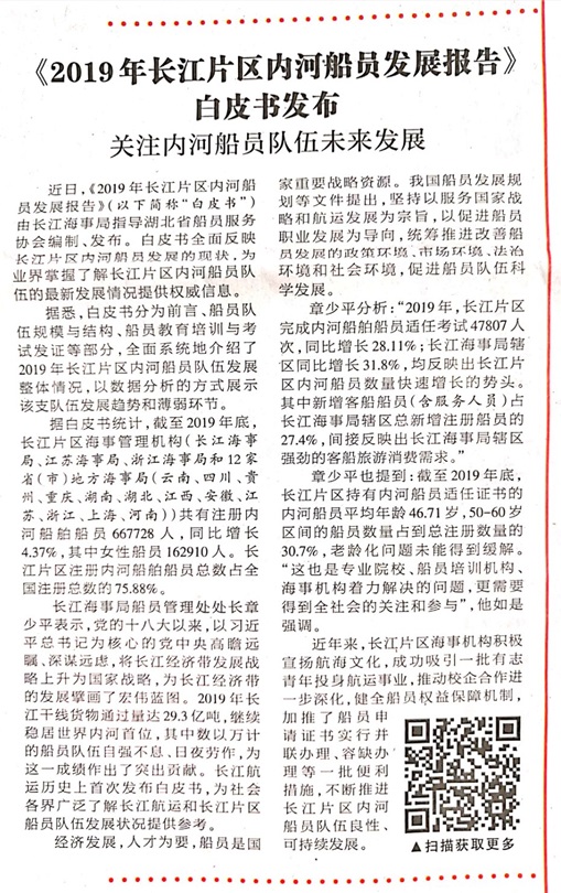 中国水运报刊登《2019年长江片区内河船员发展报告》白皮书发布